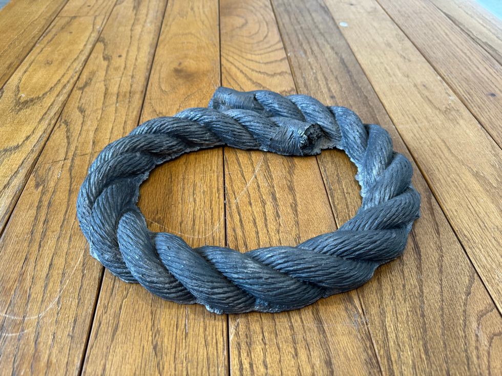 Using sand and resin molding, a two-inch rope was cast in iron, preserving its twists, compression, and surface detail. The transformation from pliable fiber to rigid metal emphasizes the shift from tension to permanence, while retaining visible evidence of strain and use. Although this piece departs materially from my rebar-based works, it continues an investigation into transformation through casting and the behavior of materials under pressure.